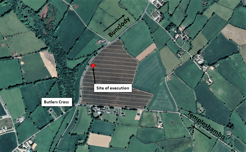 The Enniscorthy Guardian reporting on the incident stated the bodies of the men were discovered ”at the back of an unused house at Boladurragh, which is situated about half a mile from his (Patrick Skelton’s) home’. Where the bodies where found appears to also have been the same place as the execution. It ws situated on the Bunclody to Kiltealy road just north of a crossroads known as Butlers cross. Although reported as being in the townland of Booladurragh the site is actually in Boolamore townland with the road forming the border between the two.
