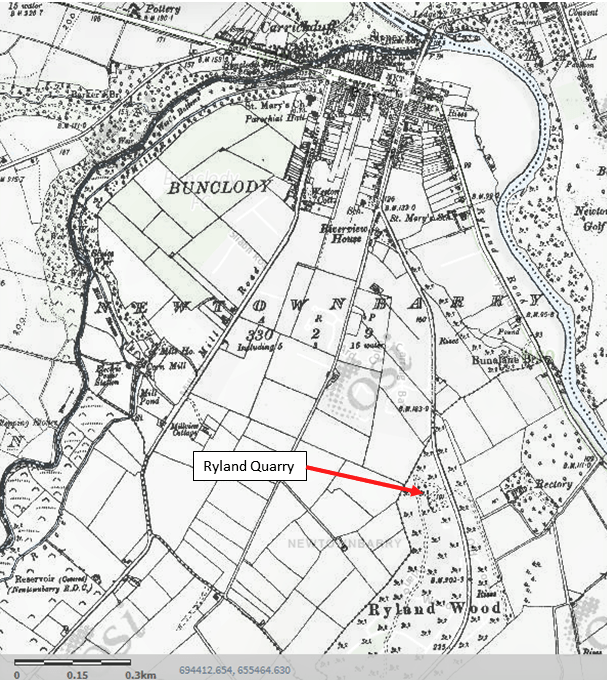 Early 1900’s OS map with location of Ryland Quarry south of Bunclody. The quarry was operated by Wexford County Council for stone used in road building, repairs etc.