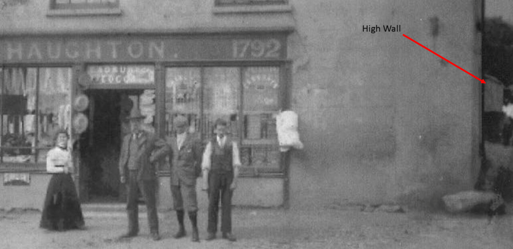 An early 20th century photo of Haughtons Corner, named so because of the shop. Notice the high wall adjoining the building, (Now a car park entrance) likely the position James O Toole would have occupied (Credit: Ferns Heritage Archive Group)