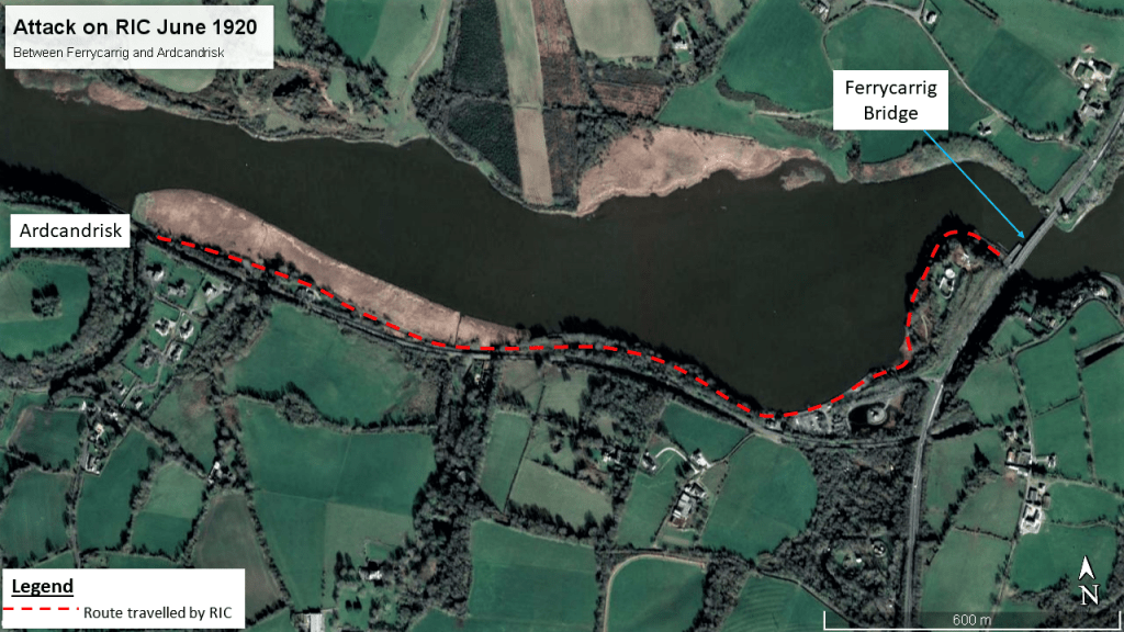 In early June 1920 two RIC police constables named Armstrong and Torsney were cycling from Wexford to the barracks in Taghmon when they were ambushed by two men. The event took place somewhere along the road between Ferrycarrig and Ardcandrisk (see map below).