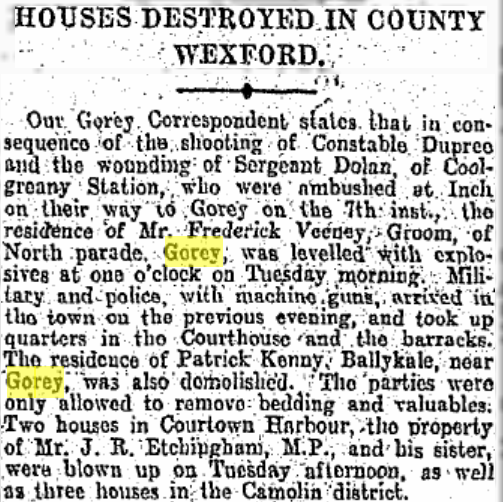 The Irish Times on the 25th May 1921, p5 reported the destruction of Veney’s Gorey stating that the residence of Frederick Veney was leveled with explosives at 1 o clock on Tuesday monring. Military and police armed with machine guns arrived in Gorey the previous evening staying in the courthouse and barracks. The injured parties were only allowed to remove bedding and valuables.