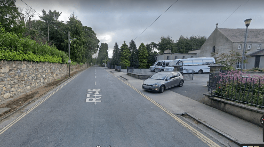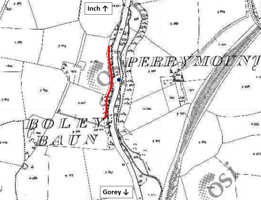 The site of the ambush is easily identifiable thanks to a description from the Enniscorthy Guardian. The journalist reporting on the incident described how the police patrol was ambushed when they ‘… reached a point about 15 yards (13.7m) on the Ferns side of the lodge leading to Camolin House’. It also describes how the bomb was thrown ‘…over the demense wall about 6ft high‘.