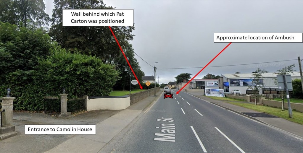The location has changed little since 1921. The entrance lodge into Camolin House, now Valentia nursing home, remains as those the boundary wall behind which Pat Carton hid. Many of the trees that make up this wooded location would have provided Pat with cover to make his escape, following the river Bann towards the eastern end of the town before crossing the road at Ballydaniel Bridge. The ambush is reported to have occured at 7 p.m. based upon the official report of the incident.