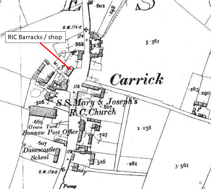‘At dark on the second day we withdrew from the position in Cobbler’s Lane and moved into a field beside the town. We had been told by the local Volunteers that a patrol of 4 to 6 armed R.I.C. men passed that way every night. As the patrol had not come at 10 o’clock we left our position in the field and moved into the town and sniped the R.I.C. barracks for about 15 minutes. The R.I.C. returned fire and sent up Verey lights. They continued firing for over half an hour after we retired.’ (Source: James O’ Toole, Bureau of Military History Withness Statement # 1084, p7)