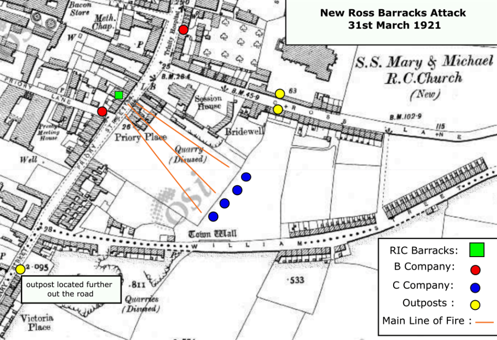 Unfortunatly no further information is avaliable regarding the attack leaving some elements of the operation unknown such as the IRA positions. The incident though is comparable to similar attacks during the period with the aim being not to capture the barracks but simply to harrass the occupants inside. this in turn would have had a knock on affect on moral for the R.I.C. A force of military of Black and Tans most likley occupied the barracks as well to augument the dwindling police numbers. The garrison however would have been well armed with rifles, revolver and grenades. In comparision to this James O’ Toole in his statement highlighted the Colum’s lack of arms just prior to the attack stating ‘At this stage we had only one or two rifles, the remainder had shotguns, but we had a good supply of buckshot.’ (Ibid)