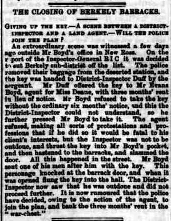 The New Ross Standard newspaper reported an interesting incident which took place between a police officer and the land agent for the Deane family, (who resided in Berkeley house and on whose estate the barracks was situated) when to returning the keys of the barracks to the latter.