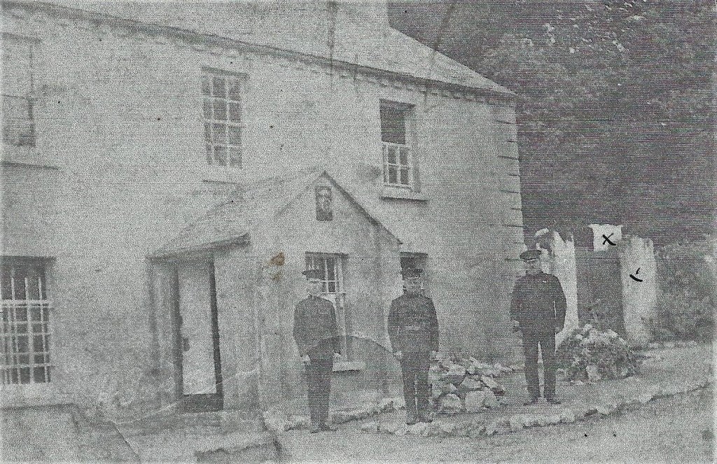 Late 19th/early 20th century photo of Ballycanew Barracks (middle building with railings). Note the three police officers standing outside and the RIC emblem just visible above the front door. (Credit: National Library of Ireland, Laurence Collection)