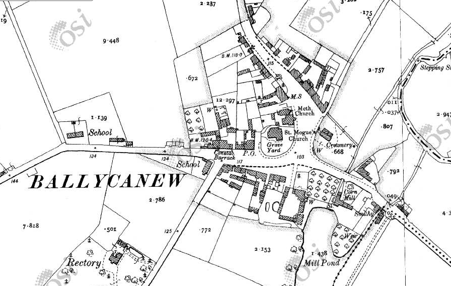 1905 ordinance survey map of Ballycanew village with location of the barracks visible opposite the school.
