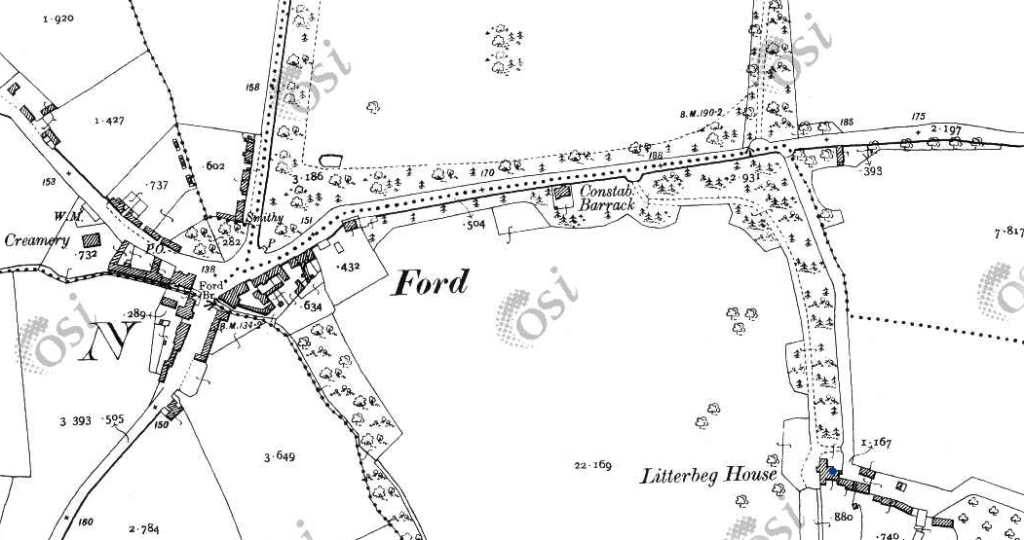 1905 ordinance survey map with the RIC barracks marked, just south of Hollyfort village.