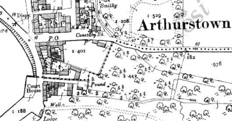 1905 OS Map of Arhturstown with location of courthouse shown fronting onto the quayside