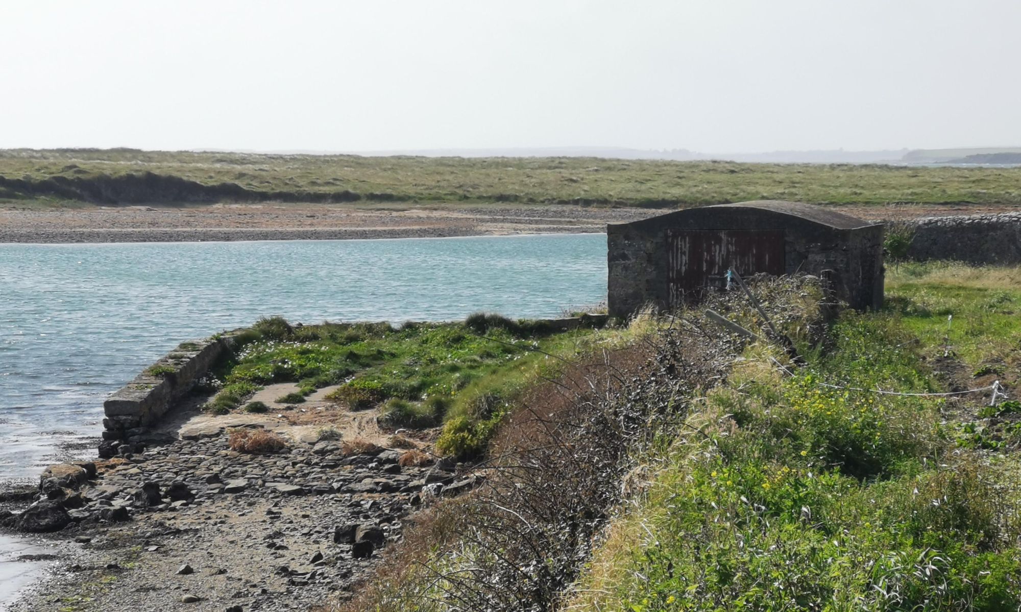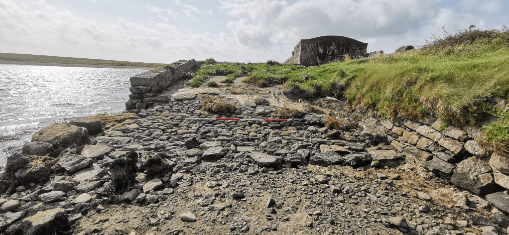 The slipway at Bar of Lough Cut stones laid along the perimeter of the site facing the sea shore. Note the high wall with the boathouse to the right.