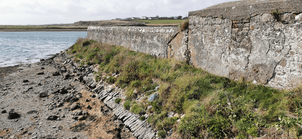 Cut stones are laid along the southern end of the site exposed to the sea. The ground here slopes gently upwards from the shore towards the seawall with the stones laid flat on top. Both elements designed to reduce erosion of the shore line. The coastguardsmen’s quarters still survives today and is a private residence.