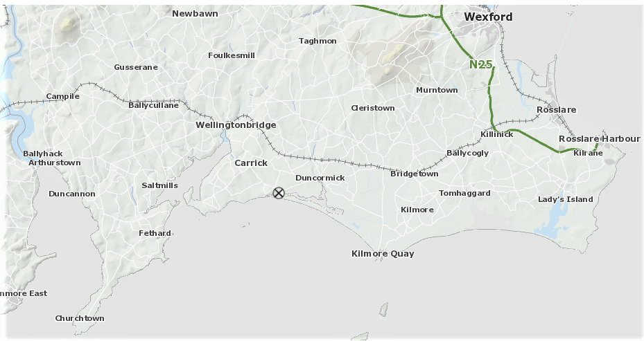 Map of south Wexford with location of Bar of Lough coastguard station marked by x