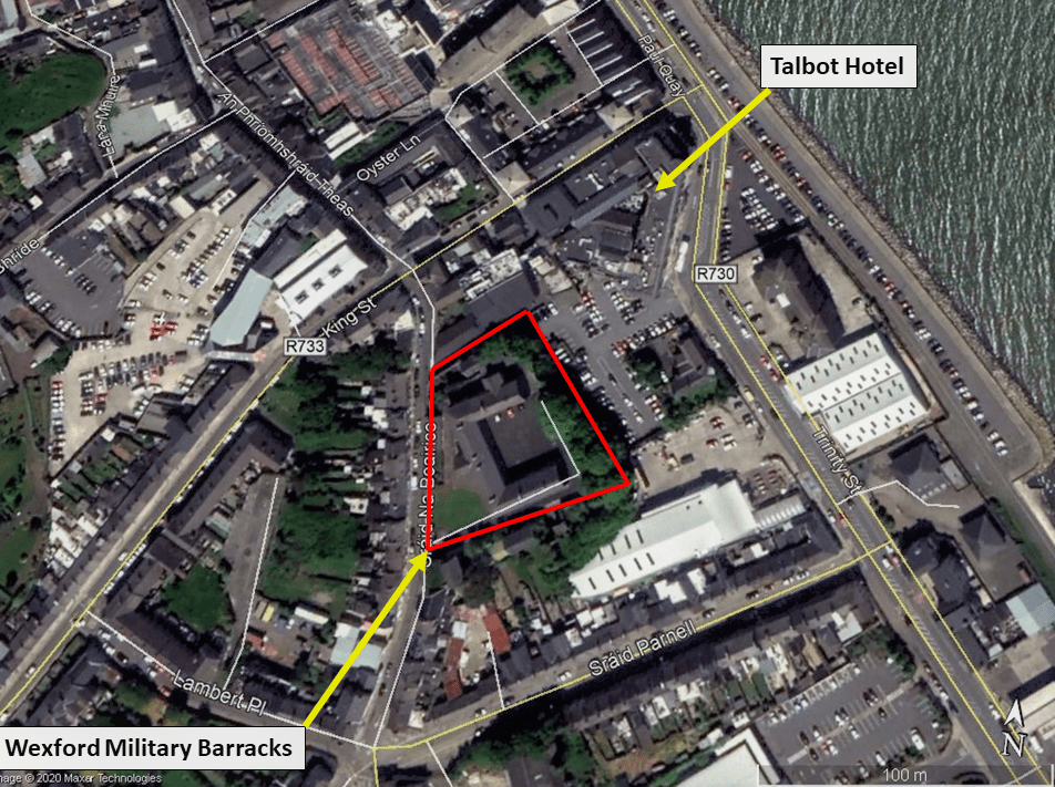 The western exterior of Wexford Military Barrack visible from Barrack St. Notice the high stone walls that surround the site and which limit access both in and out. (Google Street View)